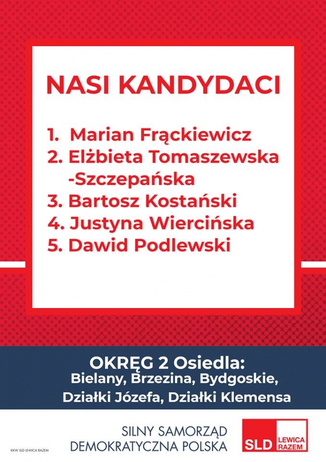 Prezentujemy kandydatki i kandydatów startujących w ramach Koalicyjnego Komitetu Wyborczego SLD Lewica Razem do Rady Miasta Torunia oraz program wyborczy – „Toruń Miastem Przyjaznym".